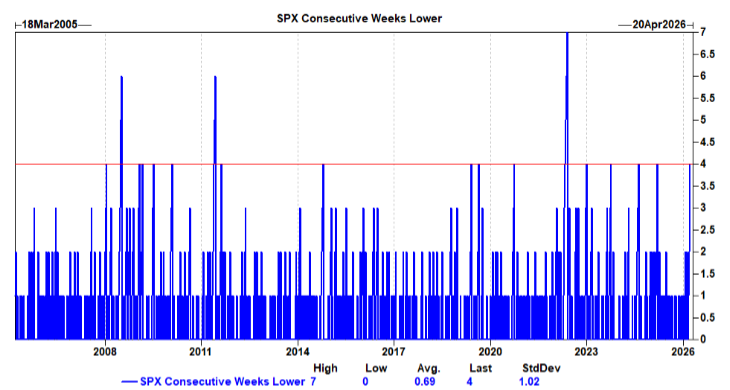 The S&P 500 just notched its 4th consecutive weekly loss, its longest losing streak since the 2025 Liberation Day meltdown. In the last 20 years, we have only seen a handful of longer streaks for the SPX.