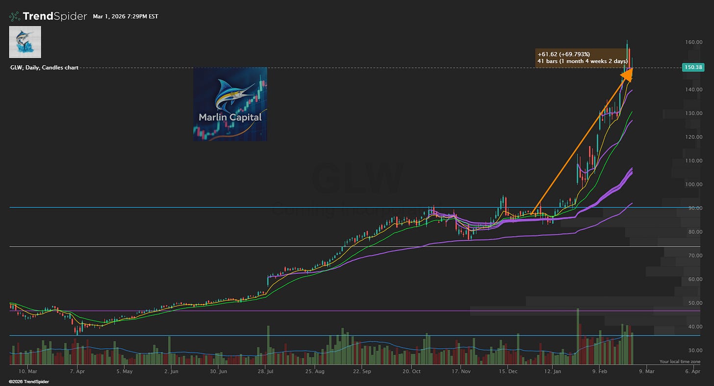 GLW is our top unrealized performer YTD and a clear market leader in the Optical Connectivity theme. As I covered in “Leaders Shine Bright”, the optical segment is growing rapidly driven by the 800G/1.6T upgrade cycle.