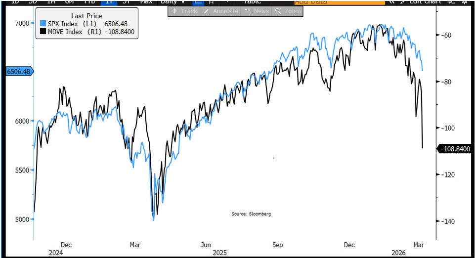 The MOVE Index (think of this as the VIX for the bond market) measures volatility in US Treasury options. When the MOVE Index is spiking, it tells you that the Bond Market is pricing in greater uncertainty and stress. This is not a signal equity investors should simply ignore.